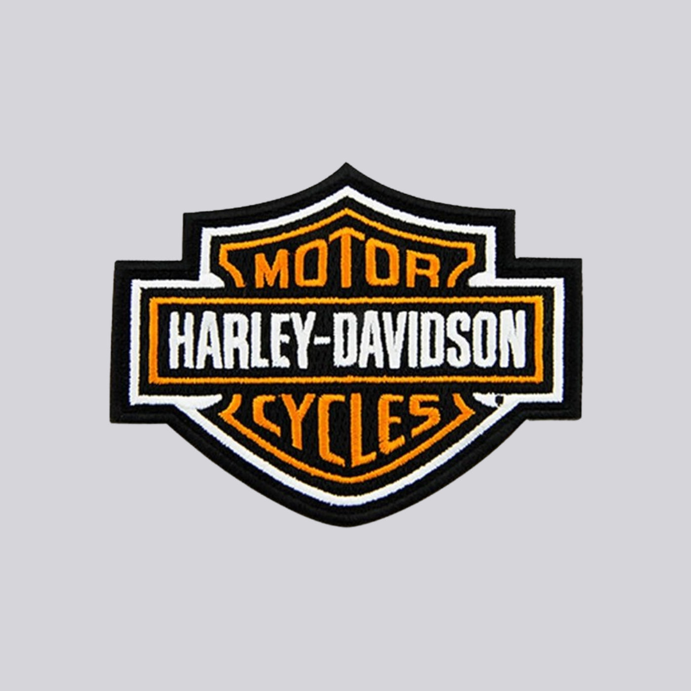 Harley-Davidson iron-on patches intended to be affixed to garments or accessories through the application of heat and pressure.